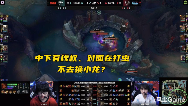 BLG已经在明牌打巢虫了,自家中路、下路都在压线,这种时候置换小龙,是没有任何风险的,但Jiejie没这么做,反而是BLG拿了巢虫,又回来把小龙收了,后续的几条龙,Jiejie也没指挥队友去占位置,每次都是隔很远尝试用技能抢一抢,结果26分钟,BLG连控四条龙,把龙魂拿到手。